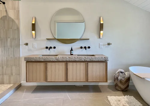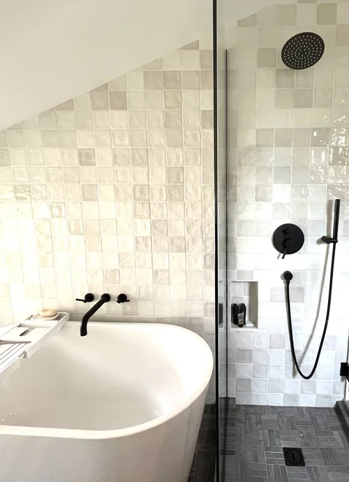 Slate hexagone mosaic floor, subway tile, shiplap walls.